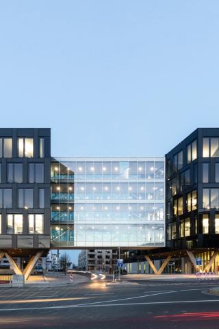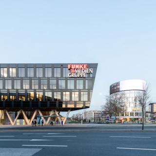 Its head: the Funke Media Tower which also accommodates the News Wall, Germany's largest LED video wall. Its fingers: the surrounding buildings, laid out for variable uses, which was a crucial factor in the planning process. Pursuant to this approach, the ensemble also comprises public areas such as lobbies, restaurants, and conference rooms as well as areas of amenity and recreation. In the interior, the pronounced planning idea is inscribed in the different usable areas: newsrooms meet offices, a day-care center for children or employee training facilities.