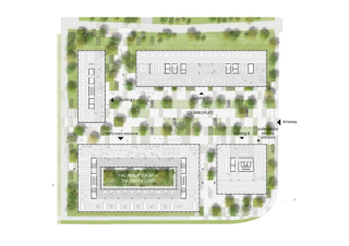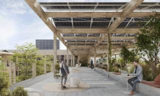 The campus consists of four individual built volumes defining a central square open on all sides. Trees alternate with lawns and unsealed surfaced areas. Parks bordering on the premises extend towards the middle and create an urban space with a green ambience, which all building entrances are oriented to. This leaves the areas right in front of the office buildings open to accommodate inviting entrance areas and enlivening gastronomic offerings. Facing Gorxheimer Straรe, a modern work and business sphere, easily visible from all directions, presents itself to the city. The maximum permitted building height for this part was not used to the full, which allows for an expansive roof garden with a lushly greened pergola and a photovoltaic system. The goal of the Hitachi Columbus Campus is climate-neutral building operation. It means that there is as much energy produced as is needed. The photovoltaic system generates electricity which can be used immediately or stored.