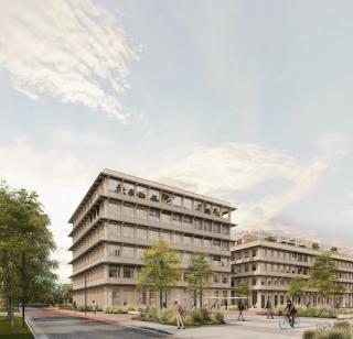 The ventilation system is based on solar chimneys, a technology that has been proven in warm countries for centuries: Fresh air from under the building moves upward through the individual riser shafts. Heating is done with low-temperature heat pumps, and for cooling, groundwater is used. Both the photovoltaic and the solar chimney systems work on the outside of the building skin and therefore are consciously made visible. The four-story office buildings are built as purely wood construction from prefabricated elements. This saves construction time and, by using a high share of renewable materials on both the in- and outsides, takes account of the ecological objectives of the Hitachi Columbus Campus: While the cozy material of wood makesfor homey comfort in the flexible work spheres inside, the weather-protective projecting concrete parts on the exterior provide for maximum durability of the façade. Combined, they give the campus lasting, that is, sustainable, beauty.