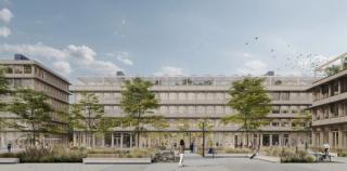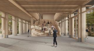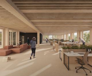 The ventilation system is based on solar chimneys, a technology that has been proven in warm countries for centuries: Fresh air from under the building moves upward through the individual riser shafts. Heating is done with low-temperature heat pumps, and for cooling, groundwater is used. Both the photovoltaic and the solar chimney systems work on the outside of the building skin and therefore are consciously made visible. The four-story office buildings are built as purely wood construction from prefabricated elements. This saves construction time and, by using a high share of renewable materials on both the in- and outsides, takes account of the ecological objectives of the Hitachi Columbus Campus: While the cozy material of wood makesfor homey comfort in the flexible work spheres inside, the weather-protective projecting concrete parts on the exterior provide for maximum durability of the faรงade. Combined, they give the campus lasting, that is, sustainable, beauty.