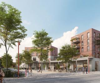 The center of the quarter is the new town square with a supermarket, café, and kindergarten. Oriented toward Holsteiner Strasse, it links the existing Brauereihof (cultural venue and restaurants) with the concave quarter’s square. A boulevard with a mobility hub overlooking the area, the quarter’s square connects to the green center of the neighborhood. Through a flight of outdoor stairs, this green space with its near-natural landscaping in turn connects to the children’s playground courtyard on the supermarket rooftop. The result is a varied loop route leading through the entire quarter. Apart from the supermarket, café, and kindergarten, the hybrid building on the town square also accommodates upper-floor apartments and most of the parking spaces. The townhouse is built in the first stage of construction, followed by a generous residential courtyard with both subsidized and privately financed units as well as terraced houses with non-underbuilt private gardens.