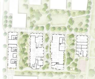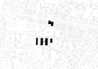 In addition to public institutions such as the local adult-education center, a kindergarten, an event venue, or a flower and a grocery store, the plinth area with a uniform four-meter ceiling height also accommodates rooms for communal use with washing facilities and access to open spaces. Each floor of the slender structures in hybrid-timber construction also has a multipurpose room for collective use as well as a separately rentable coworking space. On top of the buildings, there are freely accessible roof gardens, which are informed by local agriculture in typology and use and fully compensate for the developmentโs built-up footprint. Pergolas with photovoltaic modules offer weather-protected retreats and possibilities for urban gardening: what is watered with grey water here can later be sold as socially sustainable produce in the ground-floor store.