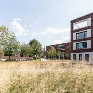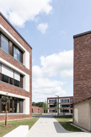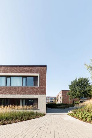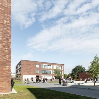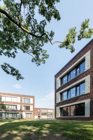 in the uniform clinker-clad façades. Inside the teaching buildings, the classrooms are arranged in a circle around a central atrium like the blades of a windmill. Open areas and niches provide facilities for a variety of forms of teaching and learning. The outdoor areas, which include a biotope pond, an open-air theater, and crop trial plots, offer individually usable and community areas for all.