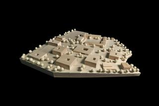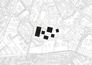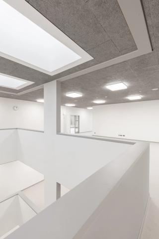 Positioned in a staggered array, the structures are subtly gradated in height and thus align with the dynamic of the marked step in the terrain. The shared multi-purpose building—the hub and center of the campus—is situated on the visual axis between the two schools’ main entrances and provides an urban-planning reference point that is visible from all sides. The compact units are all defined by straight lines and articulated in a contemporary architectural language, which, for example, expresses itself