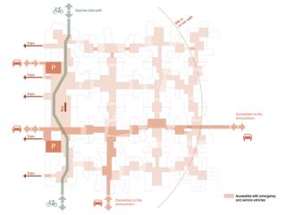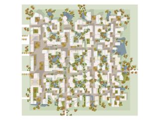 Informed by the geographical concept of the archipelago, the winning design masterplan by AllesWirdGut proposes a conglomeration of urban islands for the development areas on the periphery of Berlin: Amid a sea of as much non-built-on land as possible, residential quarters densified into easily navigable local centers are grouped into a varied sphere of living that encourages contact and social exchange. The most valuable asset of the design is the public space between buildings: generous nature-like outdoor areas frame the built structures and orient them toward the surrounding neighborhoods. Each part of the puzzle consists of 100 to 150 residential units and is defined by a central plaza. It is through this clearly articulated contact zone that the quarter interconnects with all (eight) adjoining modules. For maximum flexibility and experiential density, the design utilizes the potentials of three different outdoor spatial systems: While plazas and alleys—the urban system—provide for orientation, its natural counterpart makes for wide open areas and inner yards that are richly greened for high climate resilience. Photo-voltaic panels on pillars on the roof areas, as the third outdoor spatial system, generate electricity and provide shade for the private or semi-private terraces and gardens underneath.