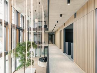 roof was pulled down to create optimal conditions for a new three-storey building that accommodates office spaces and a restaurant and is enclosed by the historical walling. The differential between the former building depth and the new skin creates a surprising, luxurious tension-loaded three-meter interval, which, through the correlations it facilitates, seeks to evoke magical moments like just right before a kiss. That in-between space is a gift and has been developed with regard to design, ecological, economic and pragmatic aspects. The concept relies on prefabricated modular elements and a mix of materials consisting of wood, clinker and metal.