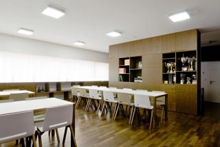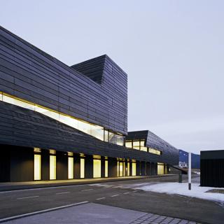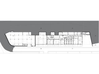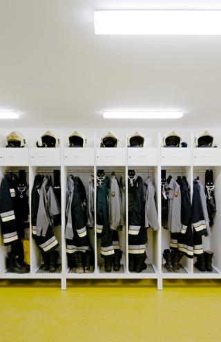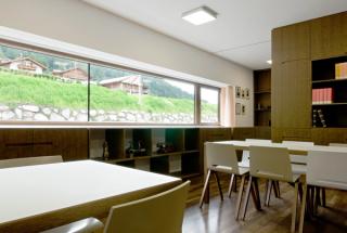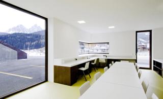 The built volume of the Civil Protection Center is ten times that of nearby houses. In order to lessen this contrast, the building makes use of the natural topography and integrates into the sloping mountainside in the north. Stretched out alongside the tangential road, the cubature naturally fits into its immediate context.