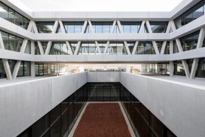 Die Struktur der Gebäude folgt einem klaren Raster mit einem Achsabstand von 5,6 Metern. Der jeweiligen pädagogischen Nutzung entsprechend kann das modulare Holzsystem variabel angepasst werden. Besonders in der Verzahnung mehrerer Elemente entstehen so Aufenthaltszonen mit heterogenem Charakter. Verschiebbare Wände und Möbel ermöglichen flexible Raumgrenzen und bieten genauso wie quadratische Cluster in neunfacher Modulgröße individuelle Gestaltungsmöglichkeiten im gemeinsamen Entwurfsprozess. Wie die typologische Ausgestaltung lehnt sich auch das Farbkonzept an die Ulmer Altstadt an: Pastellige Töne und reduzierte Materialien prägen die Anmutung des Campus’, die sichtbaren Oberflächen der Holzmodule schließen den Innenraum formal den Außenraum an.