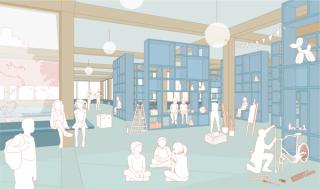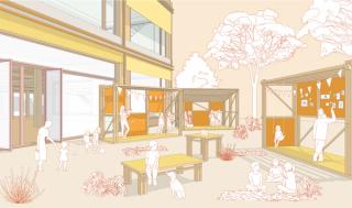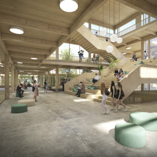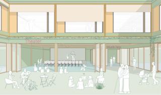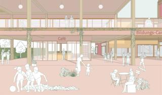 Der Mensch in der Mitte: Entlang des pädagogischen Leitfadens der Stadt Ulm übersetzt der Entwurf Merkmale lokalkoloristischer Architektur in einen naturnahen Bildungscampus mit Dorfcharakter. Unter der Prämisse des symbiotischen Miteinanders von Lehrenden und Lernenden versammelt das Quartier vielfältige Raumangebote für individuelle und kollektive Nutzungen – für Geborgenheit und Austausch, zum Experimentieren und Entfalten.