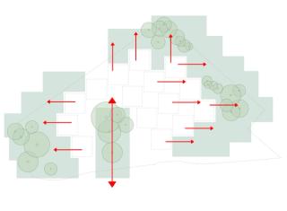 Stilprägende Elemente des historischen Stadtkerns bilden die programmatische Grundlage für den Entwurf: Das Ulmer Rathaus und der lokale Marktplatz finden in den Einheiten genauso ihre Entsprechung wie der örtliche Blockrand mit seinen grünen Höfen, die familiären Reihenhausstrukturen oder die regionalspezifischen Brücken und Mauern. Die grüne Mitte des Campus’ korrespondiert mit den Funktionen eines geselligen Dorfplatzes und öffnet das Areal mit seiner sanft eingebetteten Gebäudecollage zur bewegten Umgebung. Weitere organische Verbindung zur Natur ergeben sich über Außenräume wie Dachgärten, Terrassen und Freiluftklassenzimmer.