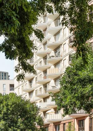 Der transparente zweigeschoßige Sockel positioniert sich ringförmig um einen Innenhof, der sich im Norden zu einem großzügigen Vorplatz öffnet. Der Sockel, der eine Schule und Kindergarten beherbergt, verbindet sich mit dem Wohnhochhaus zu einer kompositorischen Einheit, die im Innenhof, auf den beiden Vorplätzen sowie auf den Dächern mit großzügigen Grünräumen akzentuiert wird.