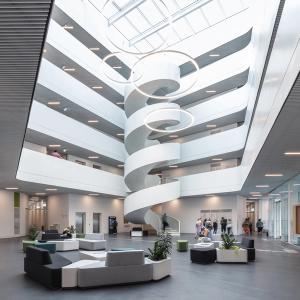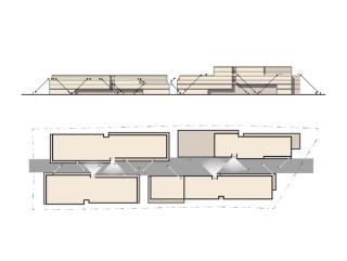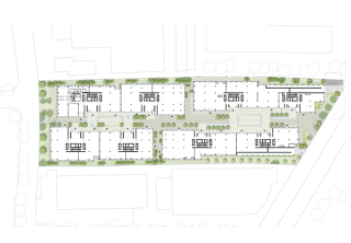 in den oberen Geschoßen sowie eingangsbildenden Rücksprüngen weiter differenziert. Die unteren Geschoße bilden mit größeren Raumhöhen und erweiterter haustechnischer Ausstattung Nutzungsmöglichkeiten, die zur Belebung des Quartiers beitragen. Neben Handel, Gastronomie und sozialen Einrichtungen werden Räume für Start-ups und neue Arbeitsformen, von kreativer Tätigkeit bis zur sanften Produktion geschaffen: Ein Stadtsockel in der Mikrostadt. Die weiteren Obergeschoße bieten flexibel nutzbare Büroflächen, die jenseits der klassischen Mittelzone mit Zellen vielfältige Bespielungsmöglichkeiten fördern und oft über angeschlossene Außenbereiche verfügen. Schmale Terrassen im Bereich der Gebäudeabstufungen sowie großzügig ausgestattete Dachflächen oberhalb des dritten Obergeschoßes eröffnen abwechslungsreiche Bezüge und treten in lebendigen Dialog mit der Strada.