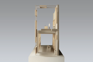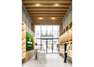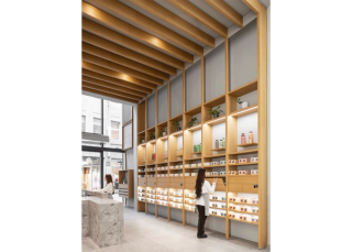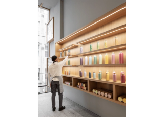 Für den zweigeschoßigen Shop unweit des Kölner Doms wurde ein innenarchitektonisches Konzept entwickelt, das seine Inspirationsquellen insbesondere in den außergewöhnlichen Etagenhöhen des Mietobjekts und dem klaren Markenversprechen von waterdrop® fand. Im Zentrum des Designs steht ein über die gesamte Vertikale gezogenes und entlang der Decke verbundenes Regalsystem. Ähnlich einem japanischen Schreintor (Torii) formt die Holzkonstruktion im Erdgeschoß ein Portal, das hinter der imposanten Glasfassade zum buchstäblichen Eintauchen in die Welt von waterdrop® lädt. Die dünnen Holzstrukturen bilden dabei nicht bloß den ästhetischen Rahmen des neuen Flagship-Stores – als überhohe