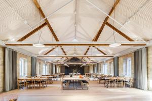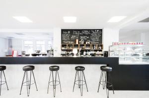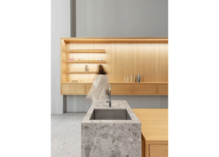 Verkaufsdisplays mit integrierten Bildschirmen, Ladenmodulen und anderweitig nutzbaren Präsentationsflächen erfüllt das Raumregal darüber hinaus auch viele praktische Funktionen eines zeitgemäßen Geschäftslokals. Die filigrane Eichenstruktur setzt sich im Obergeschoß in reduzierter Form fort, wodurch ausgestellte Accessoires genauso wie das über beide Etagen verlaufende Schaufenster weiter in den Vordergrund treten können. Seinen materiellen Kontrapunkt findet die hölzerne Stellage im grau gesprenkelten Boden in Steinoptik. Zentral im Raum treten aus diesem schlichte Barinseln mit integrierten Waschbecken hervor: Bei waterdrop® dreht sich schließlich alles ums Wasser – so auch im neuen Flagship-Store.