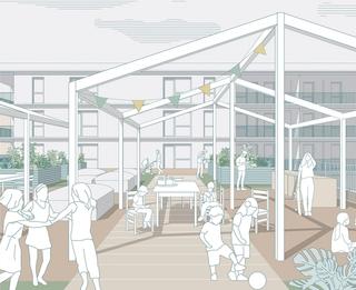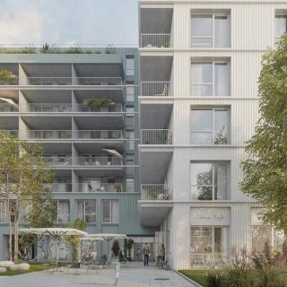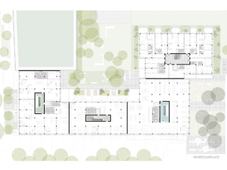 Im Erdgeschoß und in der Beletage bieten drei Viertel der Häuser Platz für Gewerbeflächen, Büros und gemeinschaftsdienliche Nutzungen wie Bibliotheken und medizinische Praxen. Der vielfältige Stadtsockel sorgt für Belebung des öffentlichen Raums rund um den Kempelenplatz und die Stichstraße (eine urbane Binnenzone) und bindet die Wohnhäuser über durchgesteckte Stadtfoyers an die intimeren Bereiche im Park an. Die Konstruktion ist als Skelettbau geplant und könnte aufgrund der konsequenten Struktur sogar in emissionsarmer Fertigteilbauweise errichtet werden. Durch die modulare Beplankung der gedämmten Holzriegelwände sind die flexibel adaptierbaren Gebäude auch im Bereich der teilbegrünten Fassaden besonders nachhaltig und wartungsarm. Die Dachflächen der obersten Geschoße werden für Photovoltaikanlagen genutzt und bieten darunter ein üppiges Lebensraumangebot für Pflanzen und Insekten, das im Bereich der Attiken um Nistkästen für Vögel und Fledermäuse ergänzt wird.
