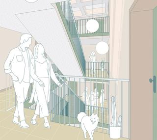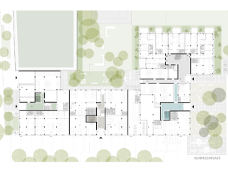 Das bearbeitete Planungsfeld im Bezirk Favoriten gliedert sich in zwei Bauplätze: einer in ortstypischer Größe und einer mit überdurchschnittlichem Volumen. Durch die Setzung von vier unikalen Bauteilen gelingt es, das sich bietende Feld funktional angemessenen zu nutzen und die kleinteilige Struktur der Umgebung in eigenständige neue Adressen zu überführen. Die farblich abgestuften Baukörper in Grau und Grün setzen diese Diversitätsmaxime in Form von individuellen Fenstern und Loggiendetails fort und artikulieren sich darüber hinaus über heterogene Dächer und Pergolen. Seine formale Klammer findet das Quartier in der Fassadengestaltung: Langlebige Wellplatten aus Faserzement geben den vier Einzelhäusern ein gemeinsames Gesicht. Um die großen Bauteiltiefen bestmöglich zu nutzen, verfügen alle Wohnungen über attraktive Stauräume in den Eingangsbereichen und vorgelagerte Freiluftzimmer an neuralgischen Punkten. Die Stiegenhäuser sind allesamt mittig gefasst und bieten durch großzügige Lufträume einladende Kommunikationszonen in der Tradition der Gründerzeitbauten.