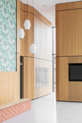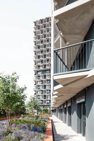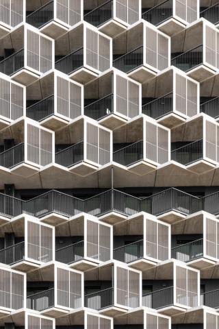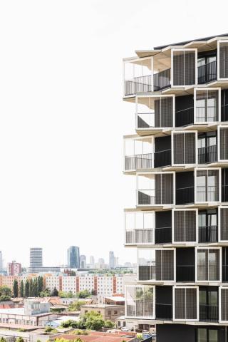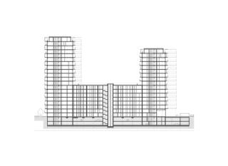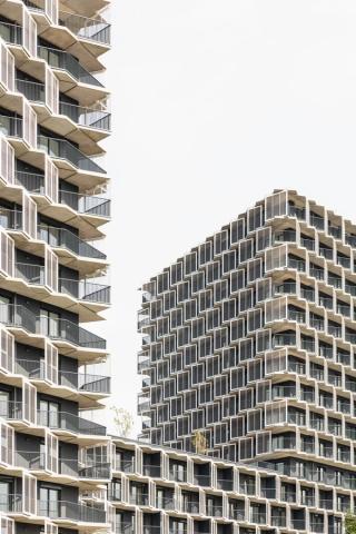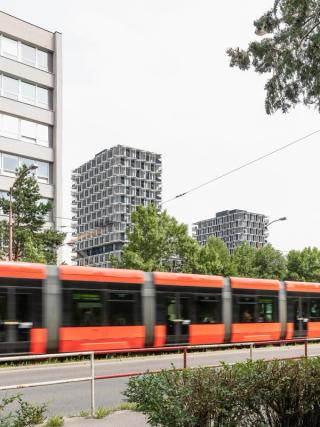 Die weithin sichtbare Anlage umfasst einen Nordturm mit 20 Stockwerken, einen Südturm mit 17 Ebenen sowie einen mittleren, verbindenden Baukörper mit acht Geschoßen. Als Design Lead Architect widmeten wir uns neben der Planung der Wohnungen – von kleineren Einheiten über Familienapartments bis hin zu Penthouses mit Terrassen – zudem der mit markanten rechteckigen Loggien gegliederten Fassade. Die dreidimensionale, raumbildende Schicht bietet einen zusätzlich nutzbaren Freiraum, schützt vor Sonne, Wind und Regen.