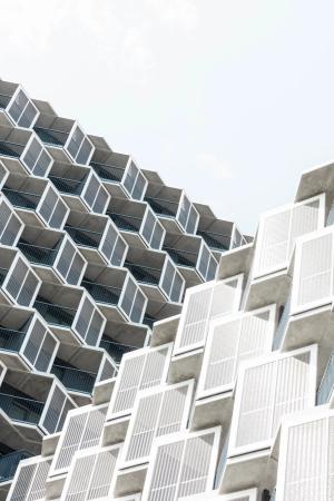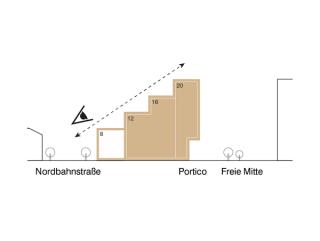 Der abwechslungsreiche Baukörper ist dabei wesentlich größer, als er zunächst aussieht. Denn ob seiner zur Nordbahnstraße abfallenden Fassade erscheint das Gebäude von jedem Blickpunkt aus anders – seine gesamte Ausdehnung wird somit geschickt kaschiert. Das schlank anmutende Wohnhochhaus orientiert sich um ein mittig situiertes grünes Herz. Zugunsten der Besonnung der Wohnungen wird die Südfassade zudem dezent geknickt und dadurch erheblich verlängert. Das Ergebnis: ein Mehr an Sonnenlicht!