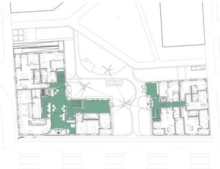For the ANUNDO residential project in Mannheim, Germany, which is intended for people 55 and older, we grouped living spaces around semipublic circulation zones and communal areas in the center of the built volume. The core elements of the two objects situated at Spinelli Park are the inside-facing circulation wells, which are distinctly outwardoriented and connect the two houses to form a harmonious compound across lawn area with loosely edged borders. The gateway to the quarter is a restaurant with generous glazing in the larger-footprint building. The inviting gesture of the plinth zone continues upward across the individual floors: gallery, chimney, and music room vertically combine with workshop, gym, and