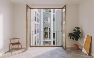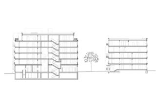 communal terrace into corresponding communication towers. The circulation areas revolving around the towers are not defined as mere hallways or staircases but rather function as a bridging element between communal (public) and residential (private). The ensemble of high-quality, energy- and resource-saving materials as well as the articulation of a distinctive faรงade from clinker, concrete, and steel are essential to the design, which, on the inside, is characterized by comfortable and homy materials such as parquet floors, natural stone tiles, and terrazzo in halls, foyers, and communal areas. Those apartments that are without loggias have large arched down-to-floor windows with French balconies.