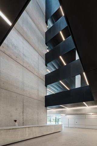 It is precisely those parameters that informed the design of the new corporate headquarters. For the landmark building in the Hohe Brücke business park, the goal was to transfer the regional rootedness of the company, embedded originally in the village-like structures of the town’s Rickenbach neighborhood, to its new location—a reinterpretation of an urban design situation which, from now on, situates the company in the plain of the Rhine valley. Completed in 2017 and articulated as an array of individual volumes, the complex with its distinctive silhouette presents itself, despite varying building heights and sizes, as an expressive architectural whole. Lined up along a spacious backbone corridor, which also accommodates all community areas, are the variably sized office areas of the individual building