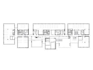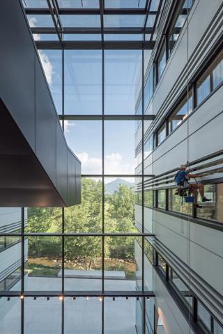 segments. In the open circulation zone with its inward, outward, and through views, communication, exchange, and collaboration are in the foreground. At the same time, the adjoining offices provide room for focused and undisturbed work. Through the interaction of these correlative factors, the building demonstrates qualities like precision, innovation, and advanced technology. In line with the company’s corporate values, it places the needs of employees in the center. Until now, though, it has only been the stage itself that has benefited from the ambience of the location, unique in Austria, whereas the path used by visitors to get from the parking lot to their seats in the auditorium and back always was an unatmospheric, merely functional access way. In brief, village-like structures for global activity.