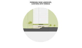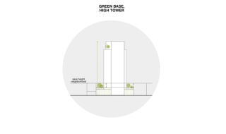 The base is deliberately lower than the surrounding buildings and thus gives the tower more “air”. The base zone mediates between the two levels on the building site and becomes a small oasis in the city thanks to the greening of the facade and the roof landscape.