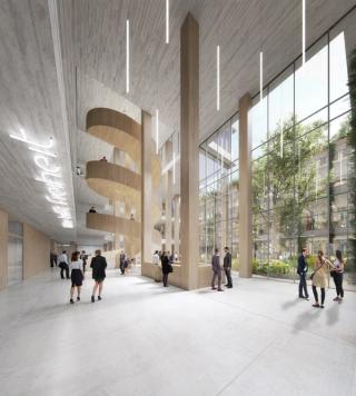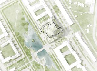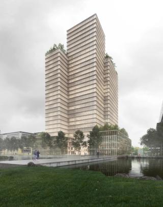 geothermal energy as well as supplementary local heating and cooling. Also in line with the desired positive eco-balance of the building is the timber-concrete composite construction of all floors of the tower. With a high degree of prefabrication and short transport routes, the hybrid construction of the ceilings also makes for a resource-efficient solution. The individually developed zigzagged facade with photovoltaic and decentralized ventilation elements combines passive shading in summer with solar energy-production in winter. The greening concept for the Technical Administration Building provides for climate-resilient and wind-resistant tree species as intensely colorful grasses and densely growing climbing plants, interweaving the building with its surroundings, from the courtyard to the roof terrace. All through the ground-floor zone, open-air space unfolds from Moskauer Strasse to the park, opening into a generous public square with amenity areas, trick fountains, and loosely planted groups of trees.