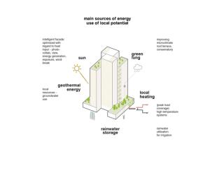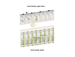 Smart facade, upper floors: power generation on the facade / reduction of solar inputs in summer through photovoltaics / the outlying offices are ventilated via decentralized ventilation elements in the facade / the brim (overhanging horizontally) also improves the sun protection