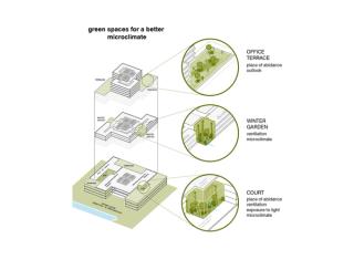 Smart facade, plinth: facade greening / shading by expanded metal panels / the outlying offices are ventilated via decentralized ventilation elements in the facade