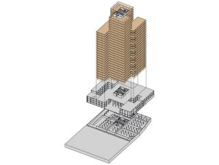 The design of the new Technical Administration Building of the municipality of Düsseldorf rests on the foundation of a permeable plinth and articulates the large built volume required in the competition brief as a slender tower of four interlocked tall blocks.
