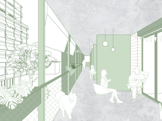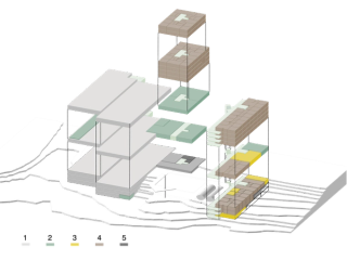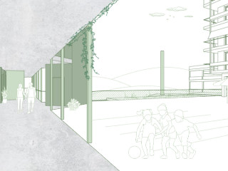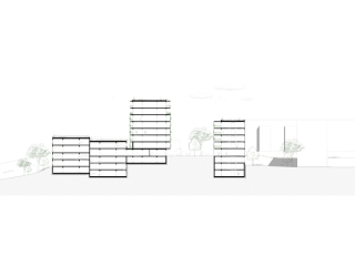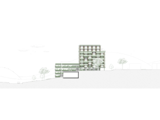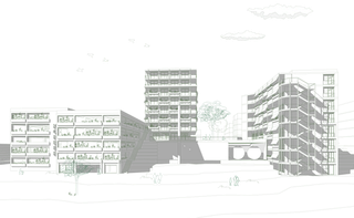 A five-story building on the west side and an eight-story block building provide the frame for this urban center while an arcade alongside the block building leads to the mobility hub which, with three basement and two upper floors, is gently embedded in the sloping terrain. Efficient parking organization and a rich offer of accompanying facilities define a modern mobility solution for the quarter. Moreover, the use concept facilitates intergenerational communion: Different apartment types adaptively cater to diverse lifestyles and needs. In particular, the concept of communal living, which aims to enable aging in the community setting, plays a central role—encouraging a life of mutual support and strengthening social exchange between generations. Flexibly organizable residential modules offer room for classical family apartments as well as for new residential types in which secluded private spaces merge into open community areas, as for example in the access balconies.
