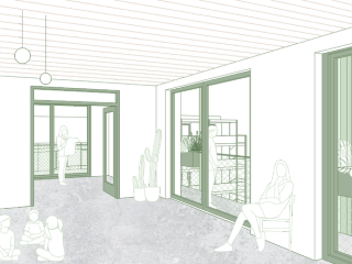 The block building with its six stories proper and two staggered stories also provides a pronounced urban-design accent. Its setback along Stauferstraße makes for a smooth transition to the surrounding buildings. All residential units benefit from optimal orientation, varied apartment types, and flexible “switchable spaces” that are adaptable to individual needs. The construction of the built volumes combines reinforced-concrete prefab framing with plywood board ceilings which enables an optimal balance of structural stability and reusability in a circular economy sense. A wood-stud construction with a rear-ventilated wood façade provides excellent thermal insulation and reduces energy requirements. Triple glazing and a glazing-to-wall-area ratio of less than 40% minimize the need for heating and cooling while wraparound balconies, exterior sun blinds, and green facades improve the microclimate and optimize heat protection in the summer.