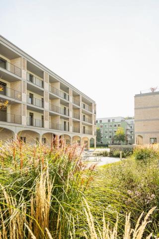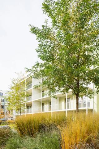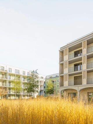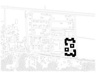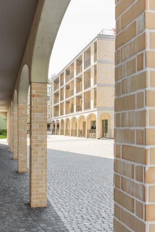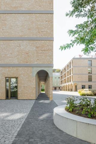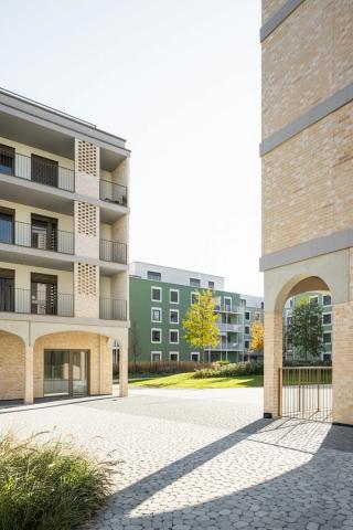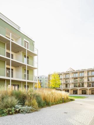 They are so mingled with one another as to create different residential typologies. Projections and setbacks on the facades create secluded spaces for private yards and at the same time establish a connection with the heterogeneous developments in the immediate neighborhood. Smaller-scale neighborhoods are planned to emerge around the stairwell entrances, which are situated facing communal open spaces. Both special-purpose buildings in the center of the quarter define the two collective usable main squares: a meeting point with a long stretched-out table is found here, as are wooden seating platforms inviting relaxation. On the south side, a market square adds to the various outdoor spaces offered.