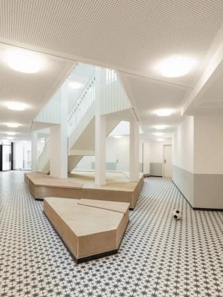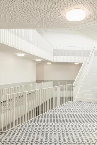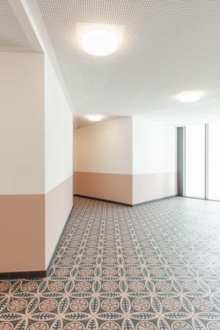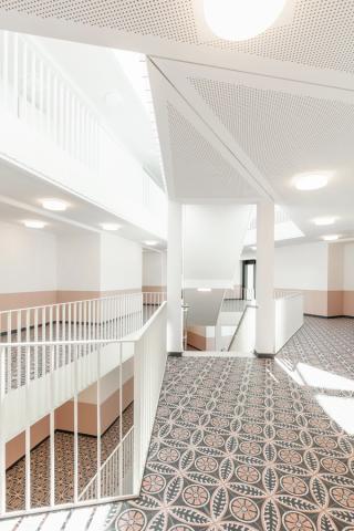 concept, which provides for communities of up to 80 residents from different generations. Following this idea, the core of each building is a central atrium stairwell which accesses an average of 27 residential units. A generously dimensioned sculpture modeled on the Gründerzeit staircase, it creates, due to its high amenity quality—daylighting, visual axes, green plants, and water—a site of lively interaction and encounter.