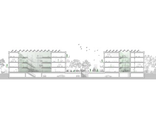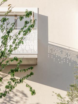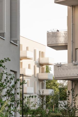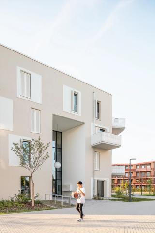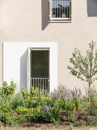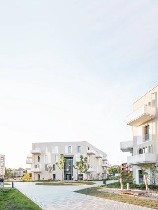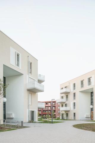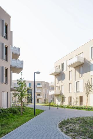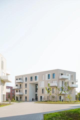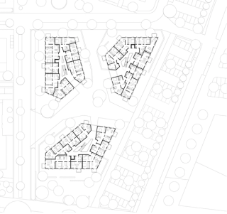 Fit into the corners of a trapezoid-shaped site, the three independent built volumes with plain façades establish a distinctive identity, informed by a flexible residential typology so as to be also able to respond to changing requirements in the future. The exterior spaces of the estate in Hanover-Bothfeld are varied, with generous greenery, and encourage community use. In the spirit of social togetherness, the project is based on the House of Life